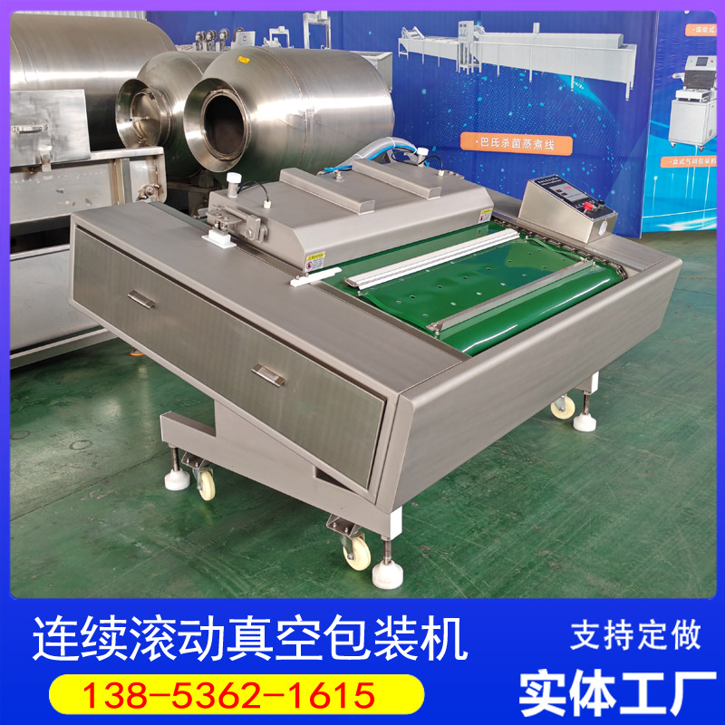 滚动式真空包装机的工作原理贴合鸭脖包装需求,采用连续滚动输送设计,传送带选用抗油、耐磨、防水材质,可平稳输送装有鸭脖的包装袋,避免汤汁溢出污染设备。设备启动后,真空室自动下落,真空泵快速抽出袋内空气,隔绝氧气与细菌,随后通过加热加压完成封口,水冷系统同步降温,确保封口线平整牢固,不易出现漏封、破袋现象,全程自动化作业,无需人工干预各环节衔接,提升包装效率。