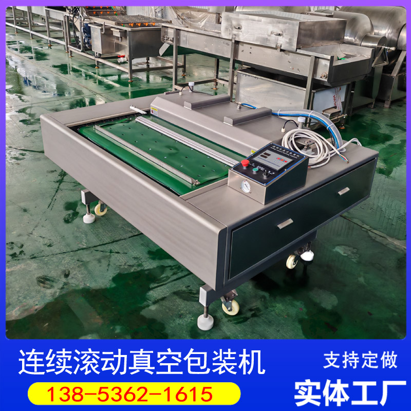 滚动式真空包装机的工作原理围绕“抽真空、轻柔封口、保鲜锁味”展开,设备采用连续滚动输送设计,传送带选用柔软、防刮材质,可平稳输送牛排包装袋,避免牛排表面出现划痕、破损。设备启动后,真空室自动下落,真空泵可选择慢速抽气模式,抽出袋内空气,同时避免因抽气过快导致牛排肉质压缩变形,使袋内形成均匀的真空环境,隔绝氧气与细菌,随后热合系统启动,采用低温封口技术,完成封口作业,避免高温封口导致牛排风味流失,水冷系统同步降温,确保封口平整牢固。